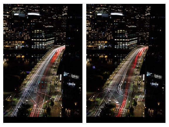 Only 1.5 minutes separated the two shots. It even looks “brighter” — maybe the bridge lights fool the eye. What do you think?
